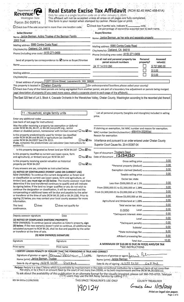 | 2 | 01/13/2021 | TD | Trustee Deed | BERMAN FAMILY TRUST 2003 | BERMAN JANICE | | | $0.00 | 190124 | 2534311 |
