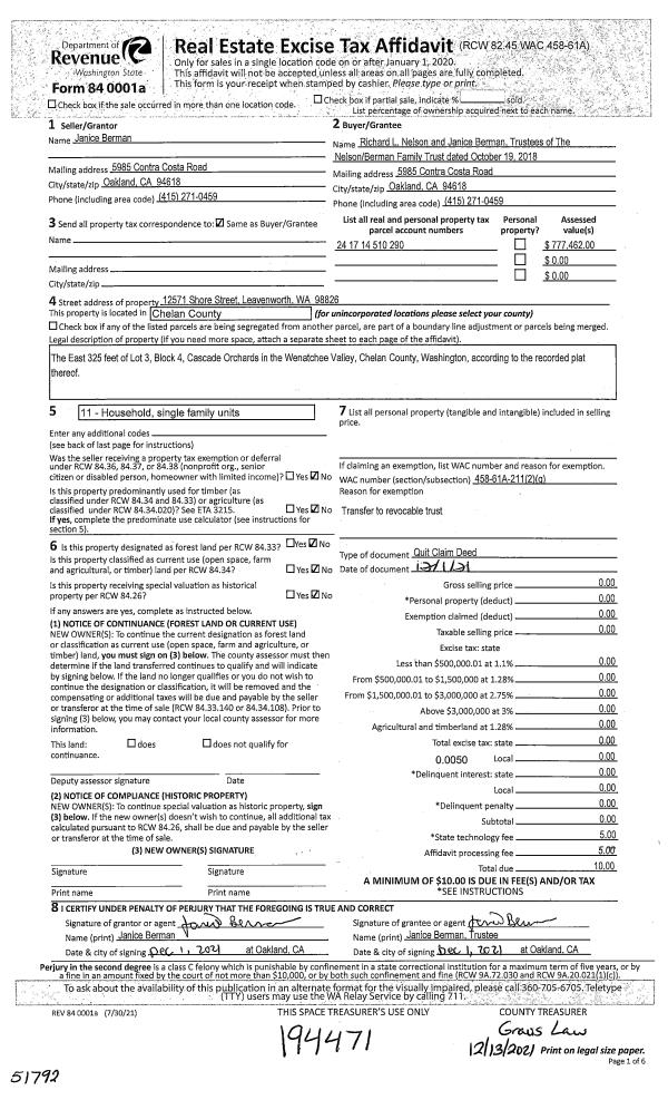 | 1 | 12/14/2021 | Q | Quit Claim Deed | BERMAN JANICE | NELSON BERMAN FAMILY TRUST | | | $0.00 | 194471 | 2558606 |