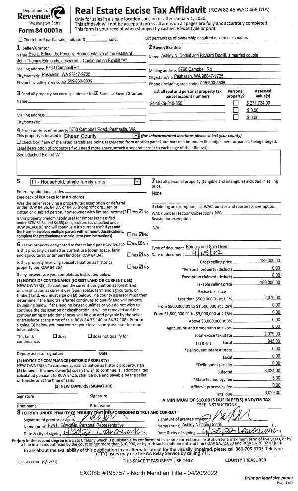 | 1 | 04/20/2022 | PR | Personal Representatives Deed | EDMONDS JOHN T | DODRILL ASHLEY N & RICHARD | | | $0.00 | 195758 | 2565851 |