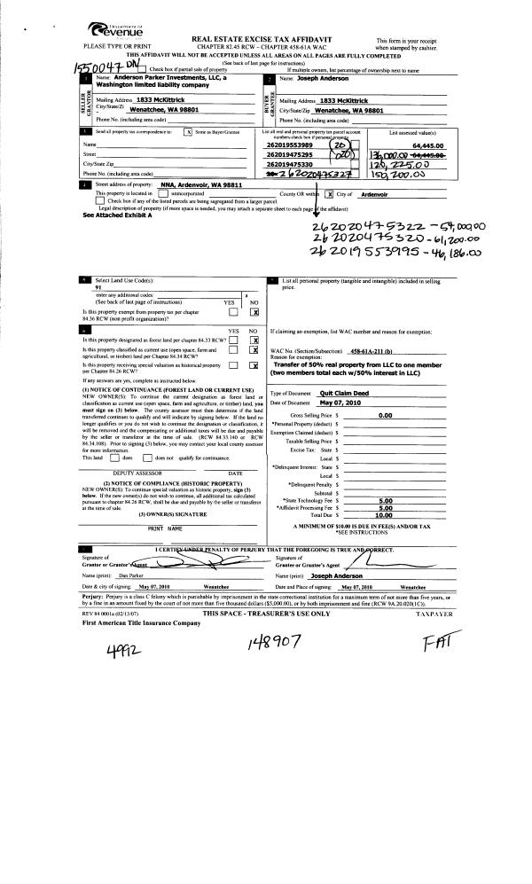 | 5 | 05/11/2010 | Q | Quit Claim Deed | ANDERSON PARKER INVESTMENTS | ANDERSON JOSEPH W | | | | 148907 | 2323061 |