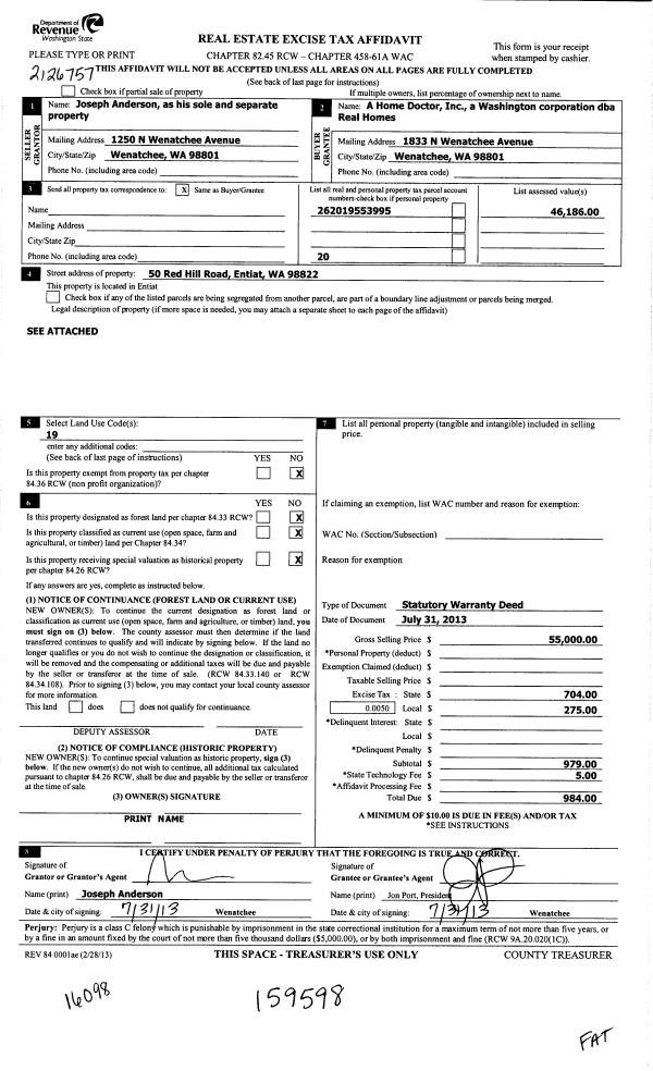 | 4 | 07/31/2013 | SWD | Statutory Warranty Deed | ANDERSON JOSEPH W | A HOME DOCTOR INC | | | $224,646.00 | 159598 | 2387221 |