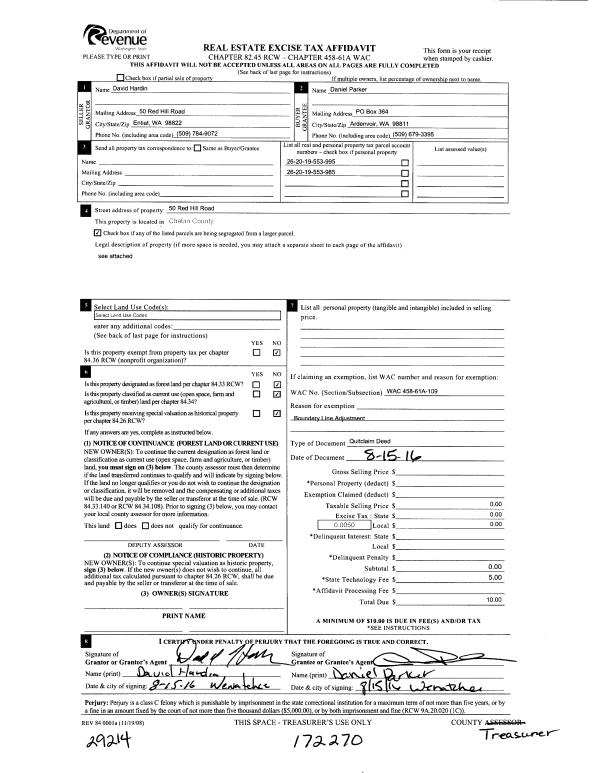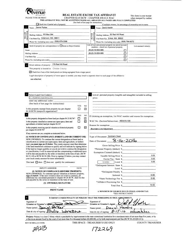 | 1 | 11/15/2016 | Q | Quit Claim Deed | PARKER DANIEL G & LORI L | HARDIN DAVID I & MARY J PERRY-HARDIN | | | | 172269 | 2447898 BLA |