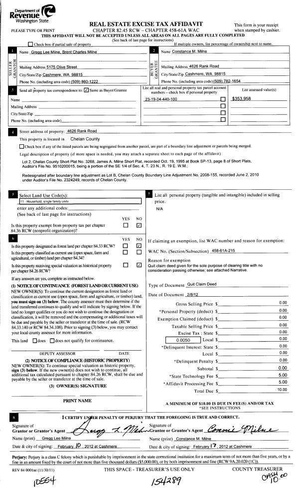 | 3 | 02/17/2012 | Q | Quit Claim Deed | MILNE GREGG L & BRENT C PR ESTATE OF JAMES MILNE | MILNE CONSTANCE M | | | | 154289 | 2356441 |