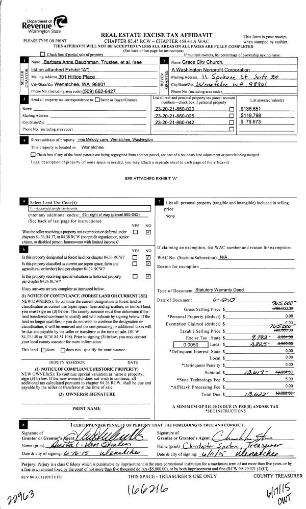 | 1 | 06/17/2015 | SWD | Statutory Warranty Deed | OGLE DOROTHY M ETAL | GRACE CITY CHURCH | | | $765,000.00 | 166216 | 2419843 |