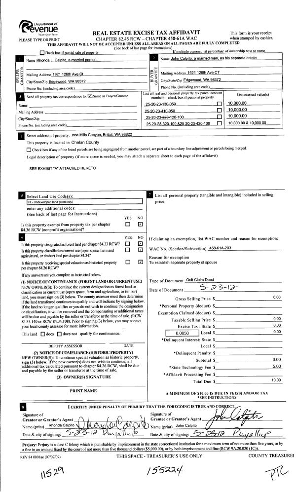 | 1 | 05/31/2012 | Q | Quit Claim Deed | CALPITO RHONDA L | CALPITO JOHN | | | | 155224 | 2361732 |