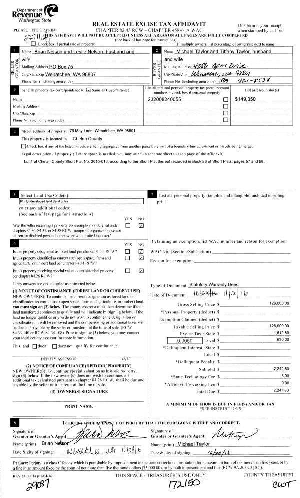 | 2 | 11/02/2016 | SWD | Statutory Warranty Deed | NELSON BRIAN & LESLIE | TAYLOR MICHAEL S & TIFFANY L | | | $126,000.00 | 172150 | 2447162 |