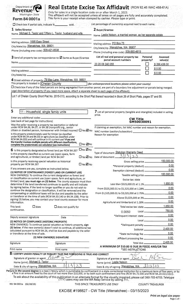 | 1 | 03/15/2023 | SWD | Statutory Warranty Deed | TAYLOR MICHAEL S & TIFFANY L | NELSON LESLIE | | | $150,000.00 | 198827 | 2579418 |