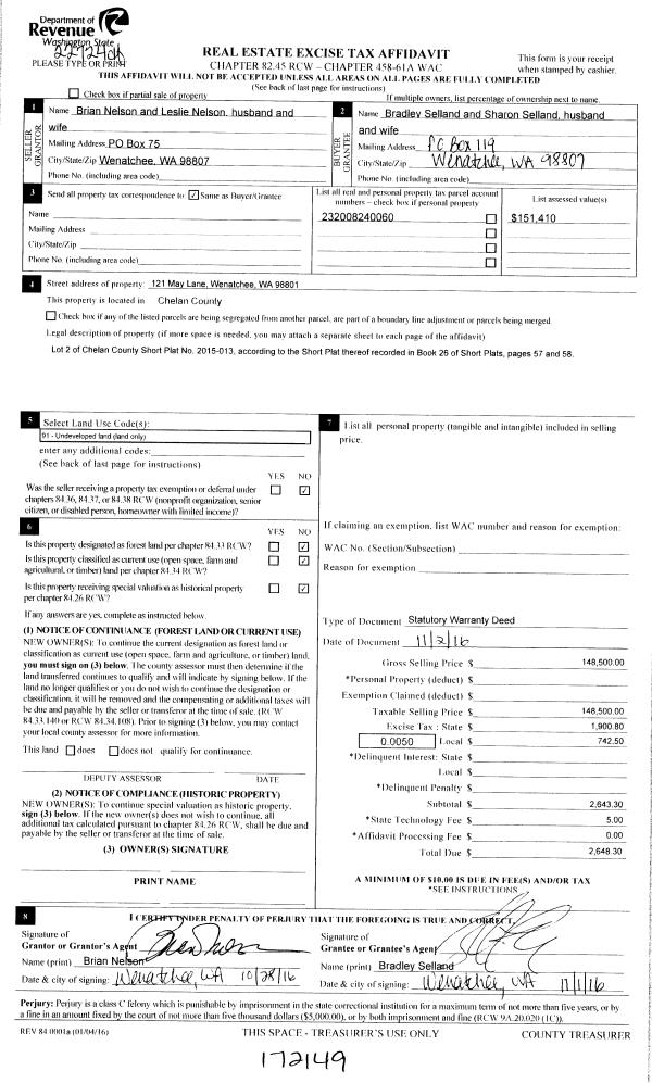 | 1 | 11/02/2016 | SWD | Statutory Warranty Deed | NELSON BRIAN & LESLIE | SELLAND BRADLEY F & SHARON | | | $148,500.00 | 172149 | 2447161 |