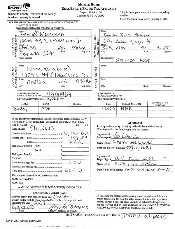 | 1 | 08/11/2023 | MH TITLE | Mobile Home Title | MERRIMAN PATRICK G | MATTESON DONALD T | | | $12,506.00 | 200152 | |