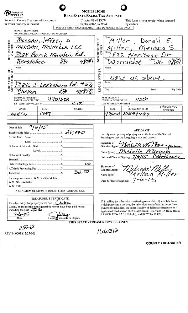 | 3 | 07/06/2015 | MH TITLE | Mobile Home Title | MORGAN JEFF & MICHELLE | MILLER DONALD E JR & MELISSA S | | | $20,000.00 | 166512 | |