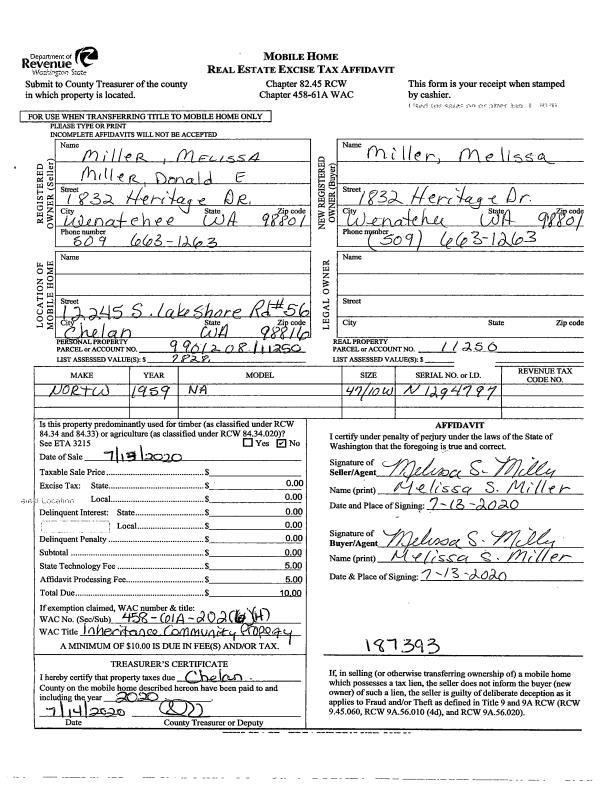 | 2 | 07/13/2020 | MH TITLE | Mobile Home Title | MILLER DONALD E JR & MELISSA S | MILLER MELISSA S | | | $0.00 | 187393 | |
