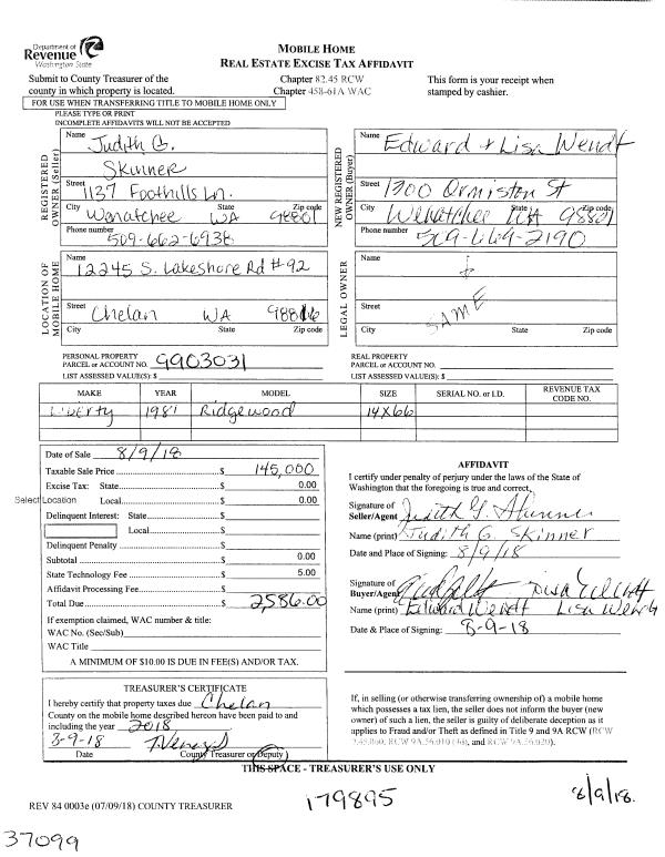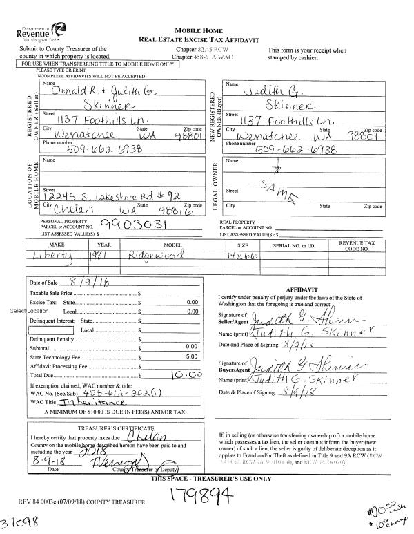 | 1 | 08/09/2018 | MH TITLE | Mobile Home Title | SKINNER JUDITH G | WENDT EDWARD J & LISA J | | | $145,000.00 | 179895 | |