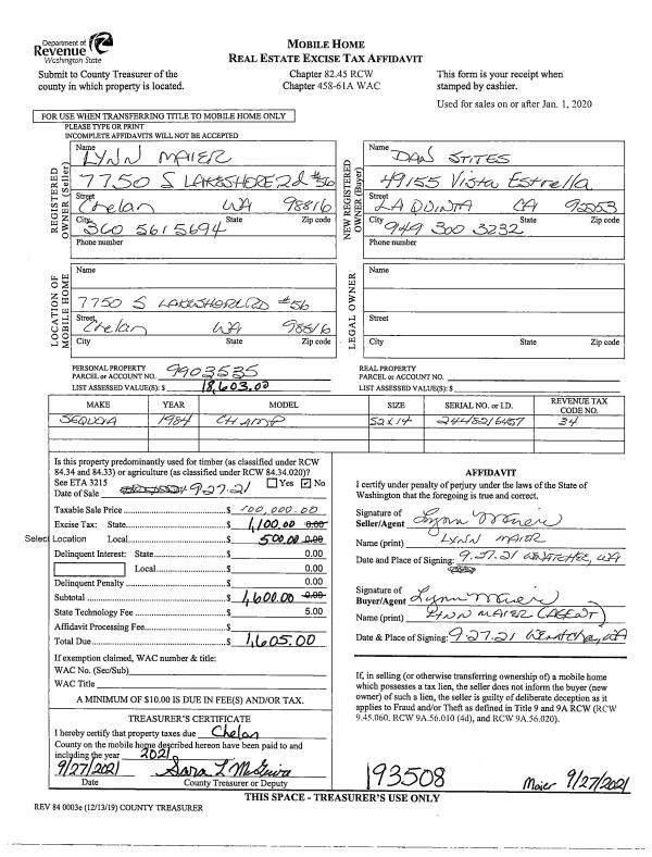 | 1 | 09/27/2021 | MH TITLE | Mobile Home Title | MAIER LYNN | STITES DAN S | | | $100,000.00 | 193508 | |