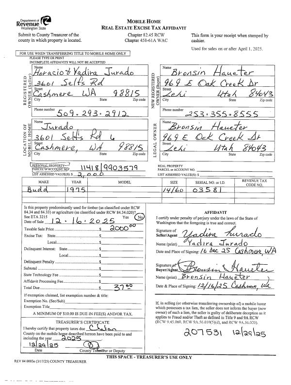 | 1 | 12/29/2025 | MH TITLE | Mobile Home Title | JURADO HORACIO B | HAUETER ROY B | | | $2,000.00 | 207531 | |