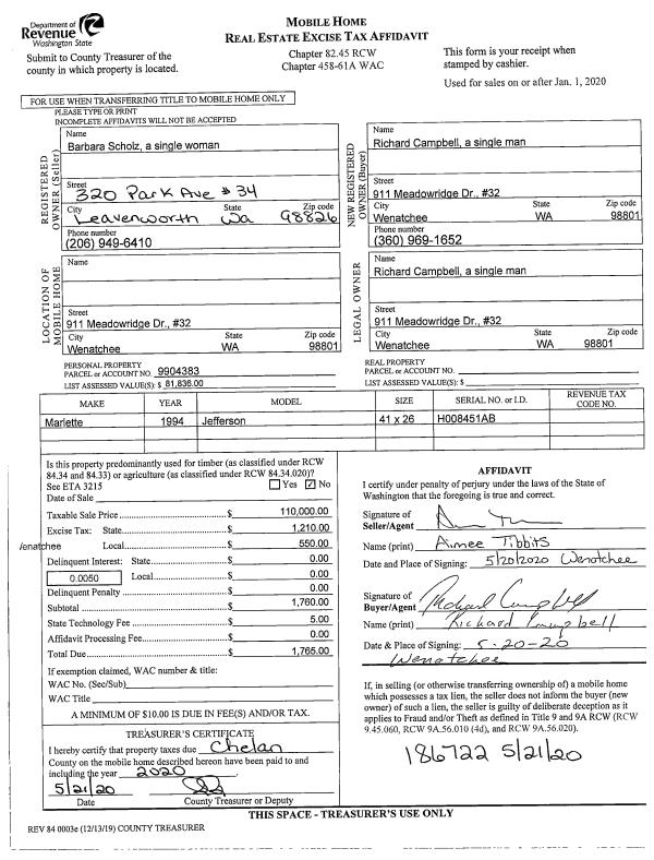 | 1 | 05/20/2020 | MH TITLE | Mobile Home Title | SCHOLZ BARBARA | CAMPBELL RICHARD | | | $110,000.00 | 186722 | |