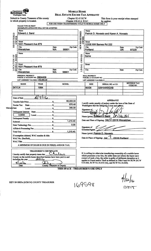 | 1 | 04/07/2016 | MH TITLE | Mobile Home Title | SAND EDWARD J | NOVASIO PATRICK D & KAREN A | | | $68,000.00 | 169598 | |