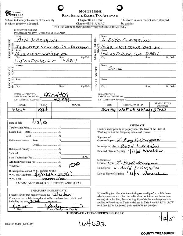 | 2 | 01/12/2015 | MH TITLE | Mobile Home Title | SCROGGINS BOYD & JEANETTE | SCROGGINS BOYD L | | | $0.00 | 164622 | |