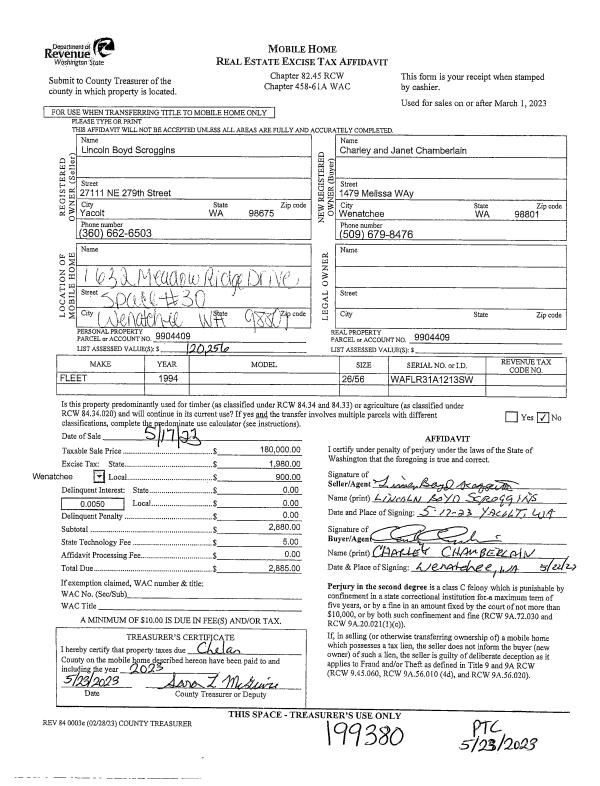| 1 | 05/17/2023 | MH TITLE | Mobile Home Title | SCROGGINS BOYD L | CHAMBERLAIN CHARLEY & JANET | | | $180,000.00 | 199380 | |