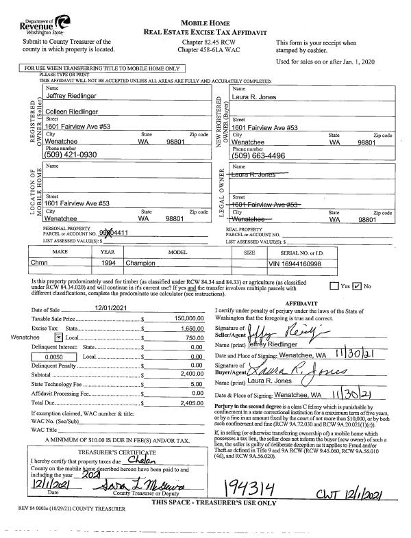 | 1 | 12/01/2021 | MH TITLE | Mobile Home Title | RIEDLINGER JEFFREY & COLLEEN | JONES LAURA R | | | $150,000.00 | 194314 | |