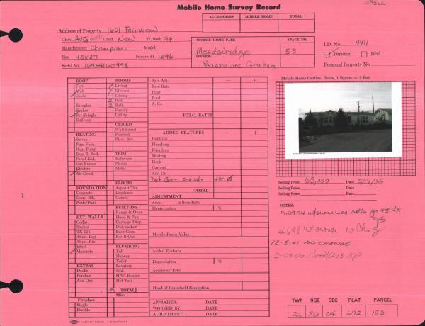 | Property ID: | 11499 | Abbreviated Legal Description: | MEADOW RIDGE MOBILE HOME PARK SPACE 53 94 CHAMPION 48X27 |