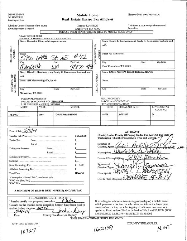 | 1 | 05/09/2014 | MH TITLE | Mobile Home Title | HINE DONALD A | RASMUSSEN DANIEL L & SANDY C | | | $58,500.00 | 162139 | |