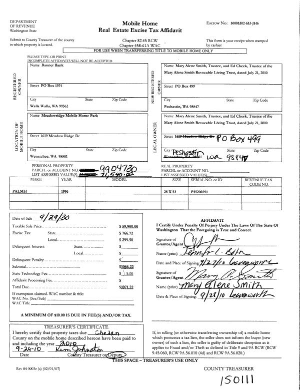 | 8 | 10/06/2010 | MH TITLE | Mobile Home Title | BANNER BANK | SMITH MARY ALENE REVOCABLE LIVING TRUST | | | | 0 | |