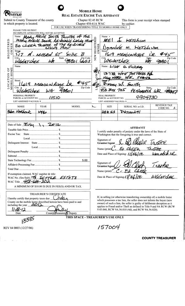 | 6 | 11/28/2012 | MH TITLE | Mobile Home Title | SMITH MARY ALENE REVOCABLE LIVING TRUST | KETCHUM MEL J & DYANNE M AUSTIN-KETCHUM | | | | 157004 | |