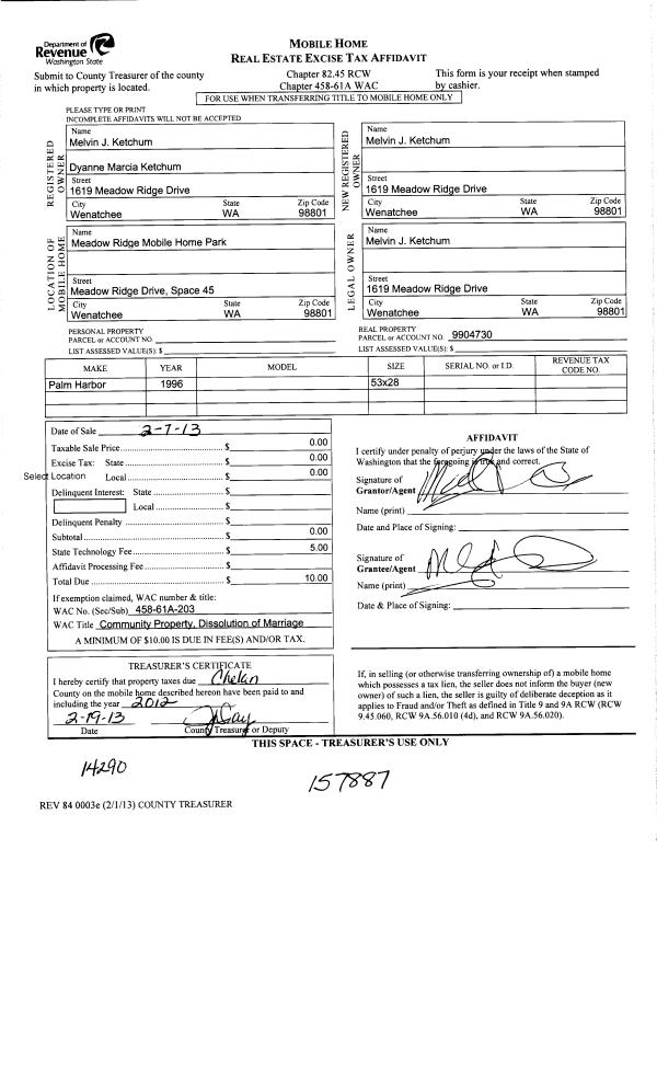 | 5 | 02/19/2013 | MH TITLE | Mobile Home Title | KETCHUM MEL J & DYANNE M AUSTIN-KETCHUM | KETCHUM MELVIN J | | | $0.00 | 157887 | |