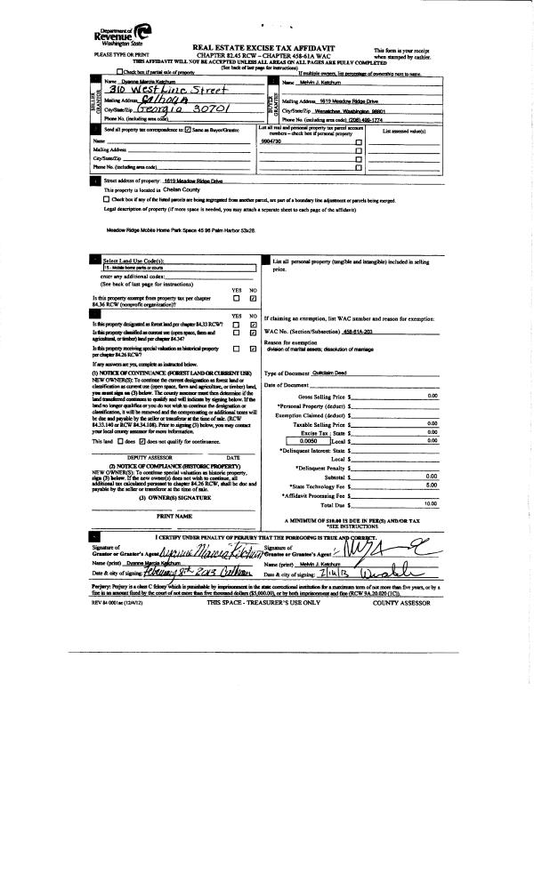 | 4 | 02/19/2013 | Q | Quit Claim Deed | KETCHUM DYANNE M | KETCHUM MELVIN J | | | | 0 | 2377102 |