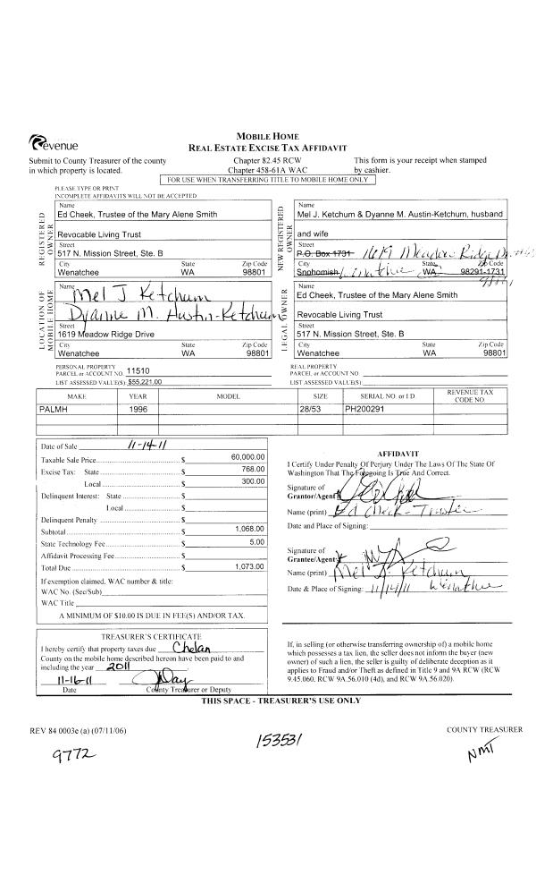 | 7 | 11/14/2011 | MH TITLE | Mobile Home Title | SMITH MARY ALENE REVOCABLE LIVING TRUST | KETCHUM MEL J & DYANNE M AUSTIN-KETCHUM | | | $60,000.00 | 153531 | |