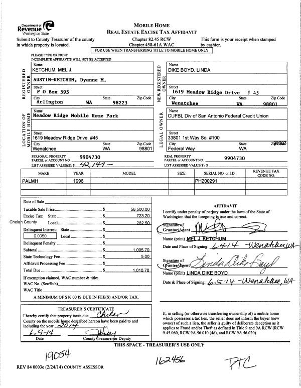 | 3 | 06/05/2014 | MH TITLE | Mobile Home Title | KETCHUM MELVIN J | DIKE BOYD LINDA | | | $56,500.00 | 162456 | |