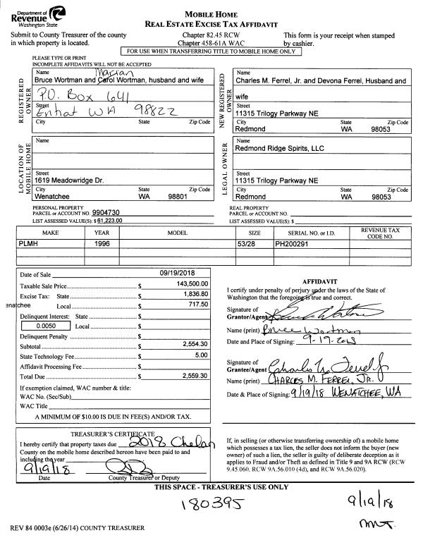 | 1 | 09/19/2018 | MH TITLE | Mobile Home Title | WORTMAN BRUCE & MARIAN C | FERREL CHARLES M JR & DEVONA | | | $143,500.00 | 180395 | |