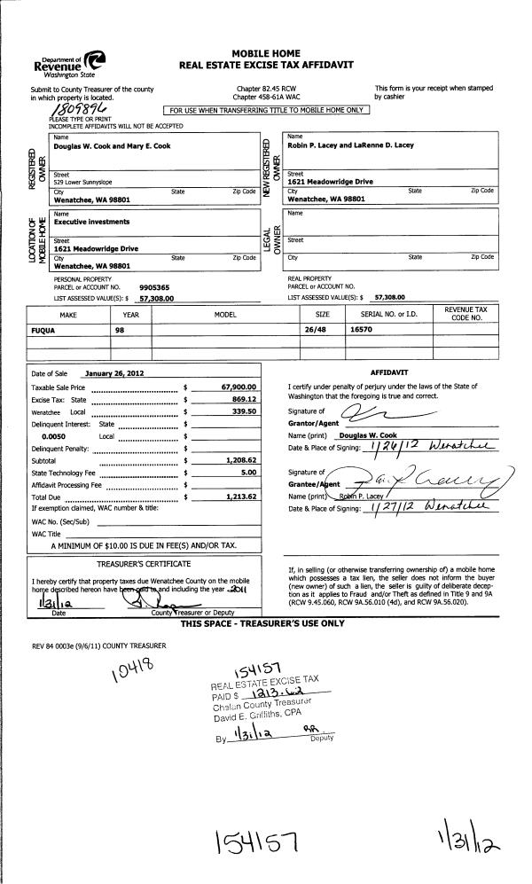 | 4 | 01/26/2012 | MH TITLE | Mobile Home Title | COOK DOUGLAS & MARY W | LACEY ROBIN P & LARENNE D | | | $67,900.00 | 154157 | |