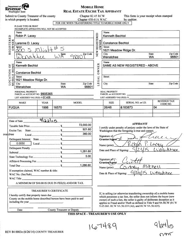 | 3 | 09/22/2015 | MH TITLE | Mobile Home Title | LACEY ROBIN P & LARENNE D | BECHTOL KENNETH & CONSTANCE | | | $72,000.00 | 167489 | |