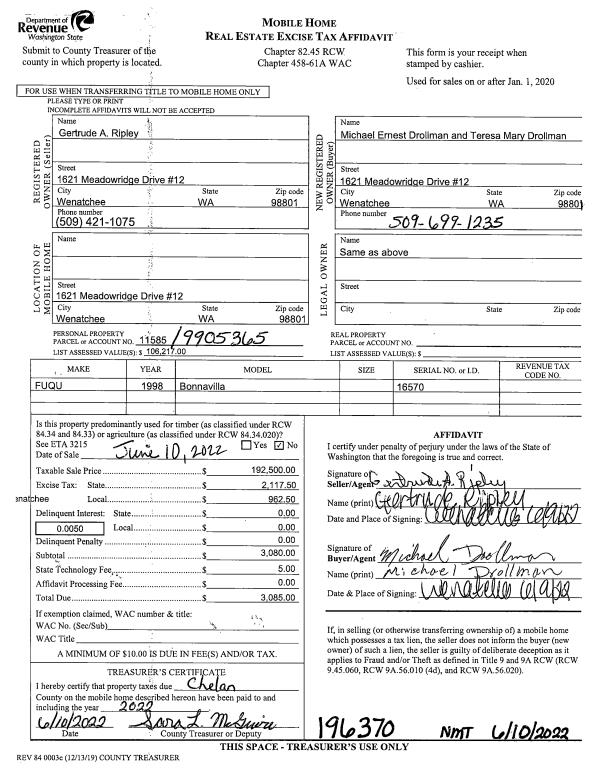 | 1 | 06/10/2022 | MH TITLE | Mobile Home Title | RIPLEY GERTRUDE A | DROLLMAN MICHAEL E & TERESA M | | | $192,500.00 | 196370 | |