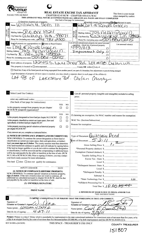 | 1 | 05/03/2011 | Q | Quit Claim Deed | SETH WILLIAM H III | GOOCH TREY & RONDA | | | $1.00 | 151807 | 2342315 |