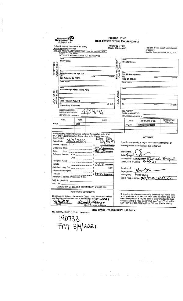 | 2 | 03/02/2021 | MH TITLE | Mobile Home Title | DREW PRUDY L | COWAN BRENDA | | | $110,537.00 | 190733 | |