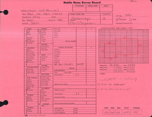 | Property ID: | 12053 | Abbreviated Legal Description: | MEADOW RIDGE MOBILE HOME PARK SPACE 8 93 VALLEY 40X28 |