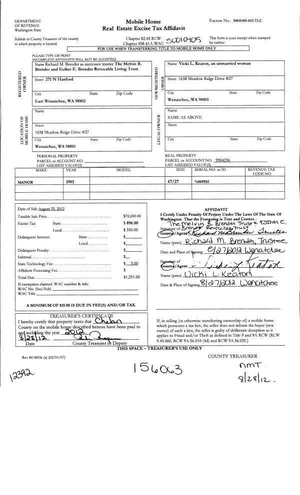 | 5 | 08/29/2012 | MH TITLE | Mobile Home Title | BRENDER MELVIN/ESTHER TRUST | KEATON VICKI L | | | $70,000.00 | 156063 | |