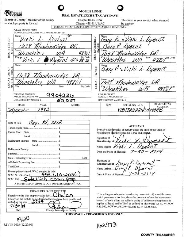 | 3 | 07/30/2014 | MH TITLE | Mobile Home Title | DYMENT VICKI L | DYMENT VICKI L & GARY P | | | $0.00 | 162973 | |