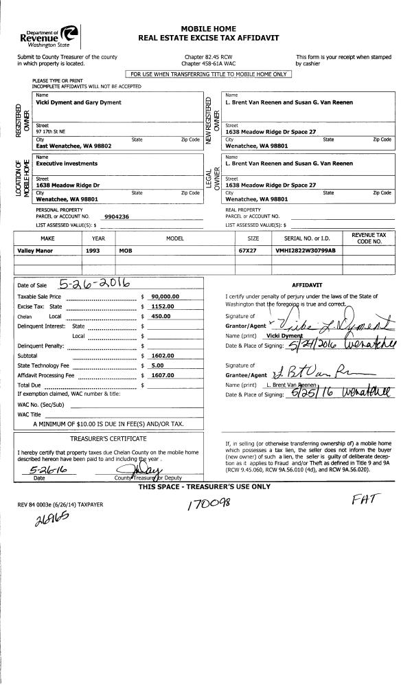 | 2 | 05/26/2016 | MH TITLE | Mobile Home Title | DYMENT VICKI L & GARY P | VAN REENEN L BRENT & SUSAN G | | | $90,000.00 | 170098 | |