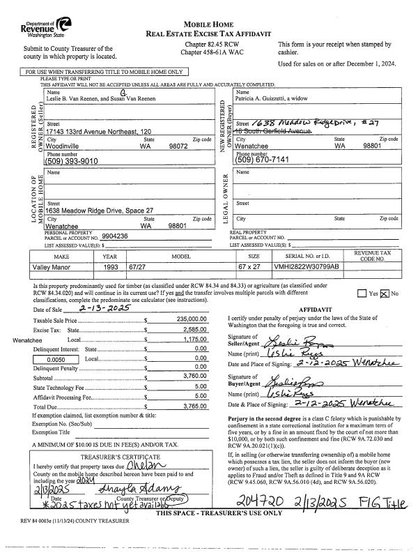 | 1 | 02/13/2025 | MH TITLE | Mobile Home Title | VAN REENEN L BRENT & SUSAN G | GUIZZETTI PATRICIA A | | | $235,000.00 | 204720 | |