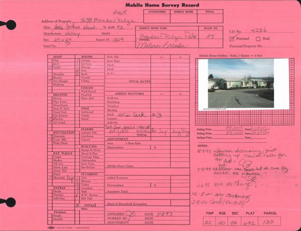 | Property ID: | 12061 | Abbreviated Legal Description: | MEADOW RIDGE MOBILE HOME PARK SPACE 27 93 VALLEY MANOR 67X27 |