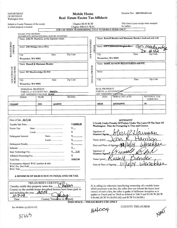 | 1 | 11/07/2014 | MH TITLE | Mobile Home Title | HARRISON JOHN R | BENDER RUSSELL & MARIANNE | | | $65,000.00 | 164004 | |