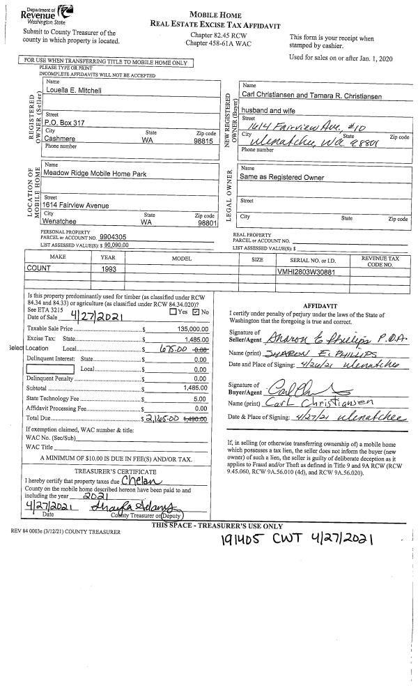 | 2 | 04/27/2021 | MH TITLE | Mobile Home Title | MITCHELL LOUELLA E | CHRISTIANSEN CARL & TAMARA R | | | $135,000.00 | 191405 | |