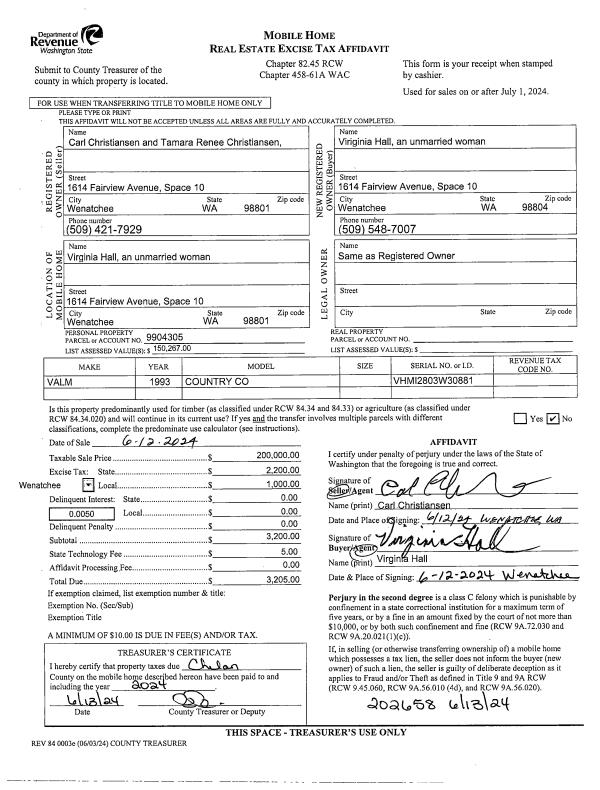 | 1 | 06/12/2024 | MH TITLE | Mobile Home Title | CHRISTIANSEN CARL & TAMARA R | HALL VIRGINIA A | | | $200,000.00 | 202658 | |