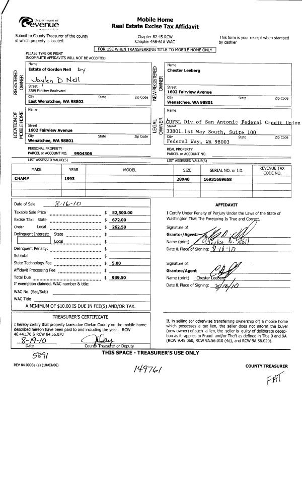 | 4 | 10/06/2010 | MH TITLE | Mobile Home Title | NELL GORDON D | LEEBERG CHESTER | | | | 0 | |