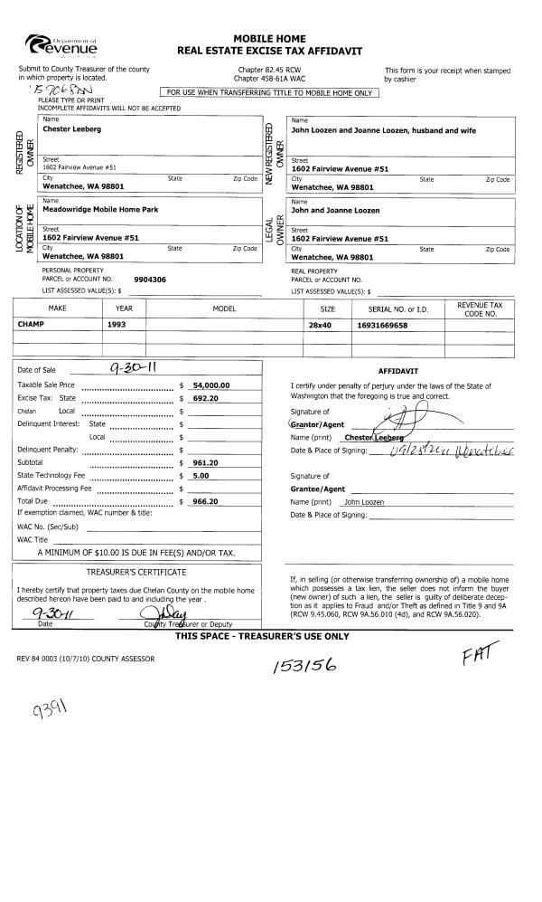 | 3 | 09/30/2011 | MH TITLE | Mobile Home Title | LEEBERG CHESTER | LOOZEN JOHN & JOANNE | | | $54,000.00 | 153156 | |