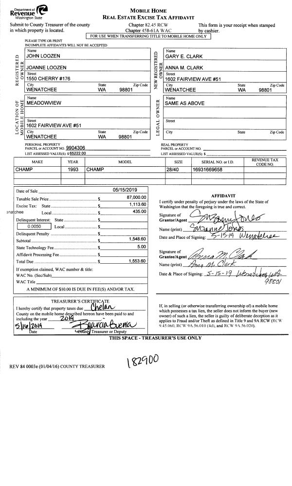 | 2 | 05/15/2019 | MH TITLE | Mobile Home Title | LOOZEN JOHN & JOANNE | CLARK GARY & ANNA M | | | $87,000.00 | 182900 | |