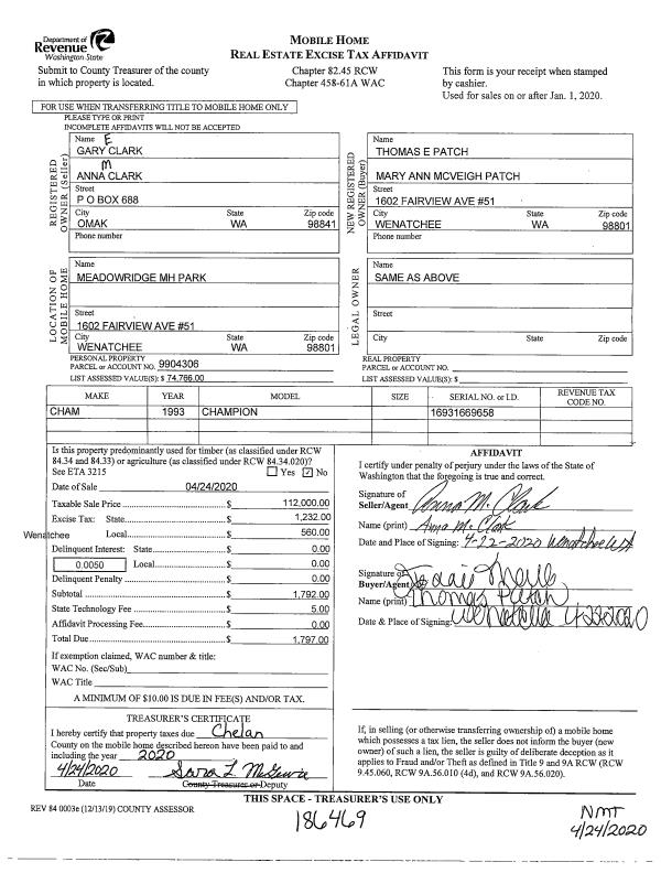 | 1 | 04/24/2020 | MH TITLE | Mobile Home Title | CLARK GARY & ANNA M | PATCH THOMAS E & MARY ANN MCVEIGH | | | $112,000.00 | 186469 | |